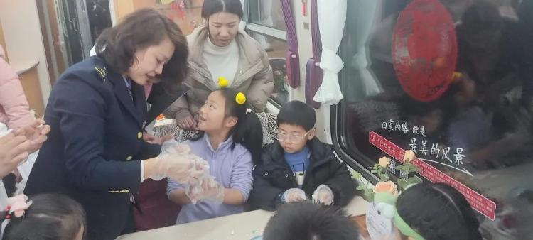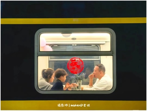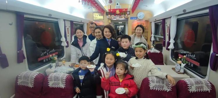 在G1005次列车上,工作人员用灯笼、窗花、灯谜将车厢装扮一新,邀请旅客一起参与文艺活动并送上元宵节祝福。