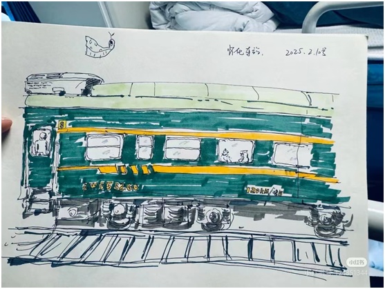 旁边停了一辆绿皮火车,草草画了一张速写。