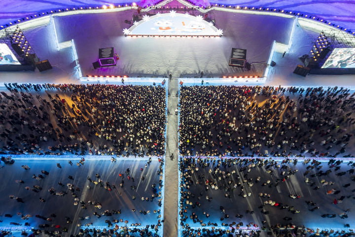 2025年1月31日,游客在哈尔滨冰雪大世界园区游玩(无人机照片)。新华社记者 张涛 摄
