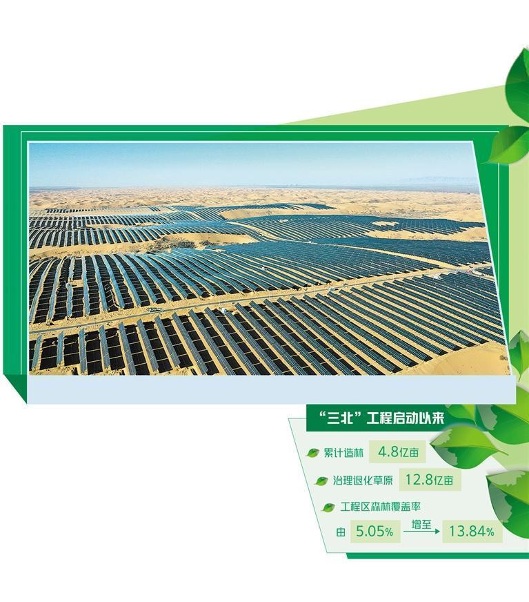 数据显示,自1978年“三北”工程启动以来,累计造林4.8亿亩,治理退化草原12.8亿亩,工程区森林覆盖率由5.05%增至13.84%,工程区61%的水土流失面积得到有效控制,广袤三北大地逐渐由黄变绿,绿色长城正不断加固延伸。