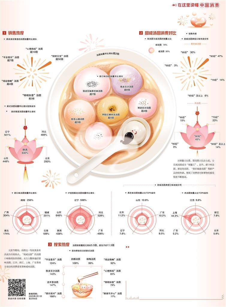从甜咸口味的融合创新,到更加强调美好寓意,再到以多种玩法实现“出圈”,汤圆不仅满足了味蕾的需求,更成为情感与文化传承的载体。一碗热气腾腾的汤圆,馅料不同、口味各异,都承载着人们对家庭团圆、生活美满的祝愿。 (作者:董 菲 来源:经济日报)