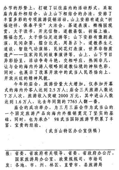 三月三庙会是武当道教和民间活动的一大盛事,早已成为武当山传统的节庆活动。1998年的庙会注重内容的广泛性、艺术的通俗性。在办节的指导思想上,彻底转变了以往办节的观念,坚持以市场为导向,变政府行为为社会行为,按照群众活动群众办的思路,发动社会各界广泛参与。在宣传促销上,注重发挥旅行社的媒介作用,广泛利用已建立的网络关系,招徕菲律宾、英国、新加坡、中国台湾、中国澳门等6个国家和地区的旅游团队8个、500余人以及国内各周边省份两万多人前来赴会。