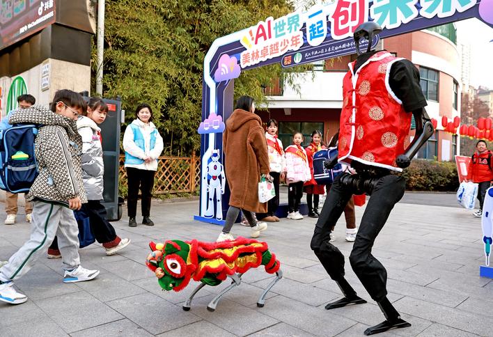 当天,武汉市洪山区未来实验外国语学校美林校区校门口,也有身着大红袄的仿人机器人与披挂舞狮套装的机器狗“科技迎新”,还为返校学子献上“科目三”舞蹈表演。