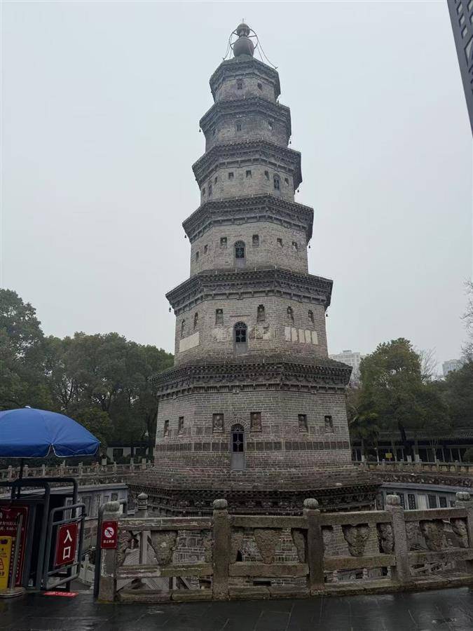 2月11日,细雨绵绵,江风刺骨,荆州长江大桥下的万寿园里,依然有游客进入参观万寿宝塔。