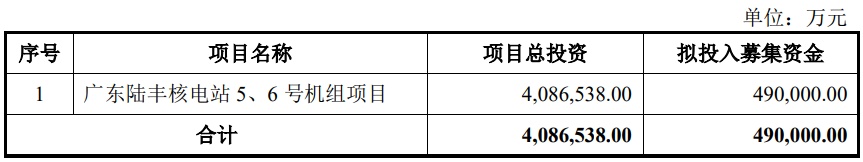 中国广核2025年1月17日披露的向不特定对象发行A股可转换公司债券并在主板上市募集说明书(修订稿)显示,公司本次向不特定对象发行A股可转换公司债券募集资金总额不超过人民币490,000.00万元(含本数),扣除发行费用后的募集资金净额拟用于广东陆丰核电站5、6号机组项目。