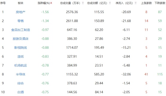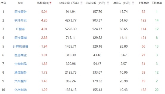 板块方面,医疗服务、软件开发、IT服务等板块涨幅居前,房地产、零售、食品加工制造等板块跌幅居前。