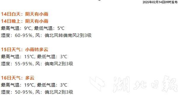 湖北日报讯(记者汤炜玮、通讯员陈声超)2月14日从武汉市气象局获悉,预计明天武汉市持续降水天气,后天天气放晴,气温回升,最高气温有望达到19℃左右。