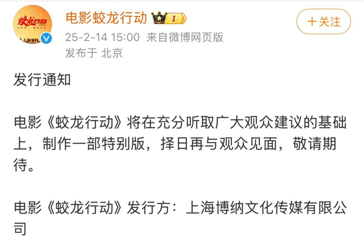 但事实上,即便是春节档结束了,《哪吒2》依然表现强势,甚至越战越勇,留给其他影片的生存空间依然很小。在此现实之下,《蛟龙行动》发文宣布,片方将在充分听取广大观众建议的基础上,制作一部特别版,择日再与观众见面。