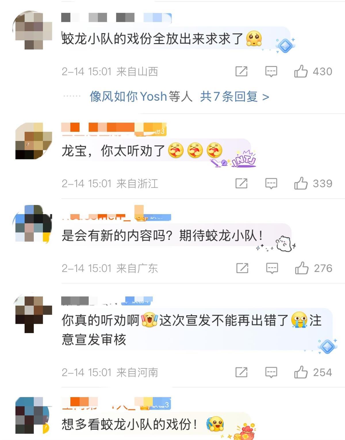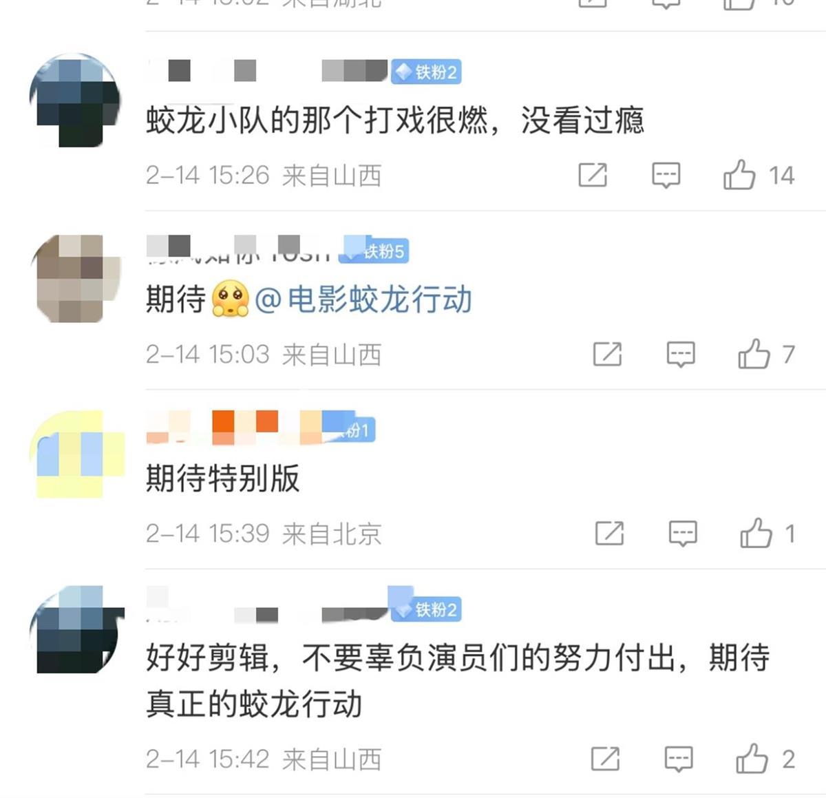 记者在《蛟龙行动》官方账号留言区看到,很多观众都强烈建议导演重新剪辑一次,让蛟龙小队的戏份更丰富一些,把之前剪掉的部分演员互动戏都重新放进电影里。
