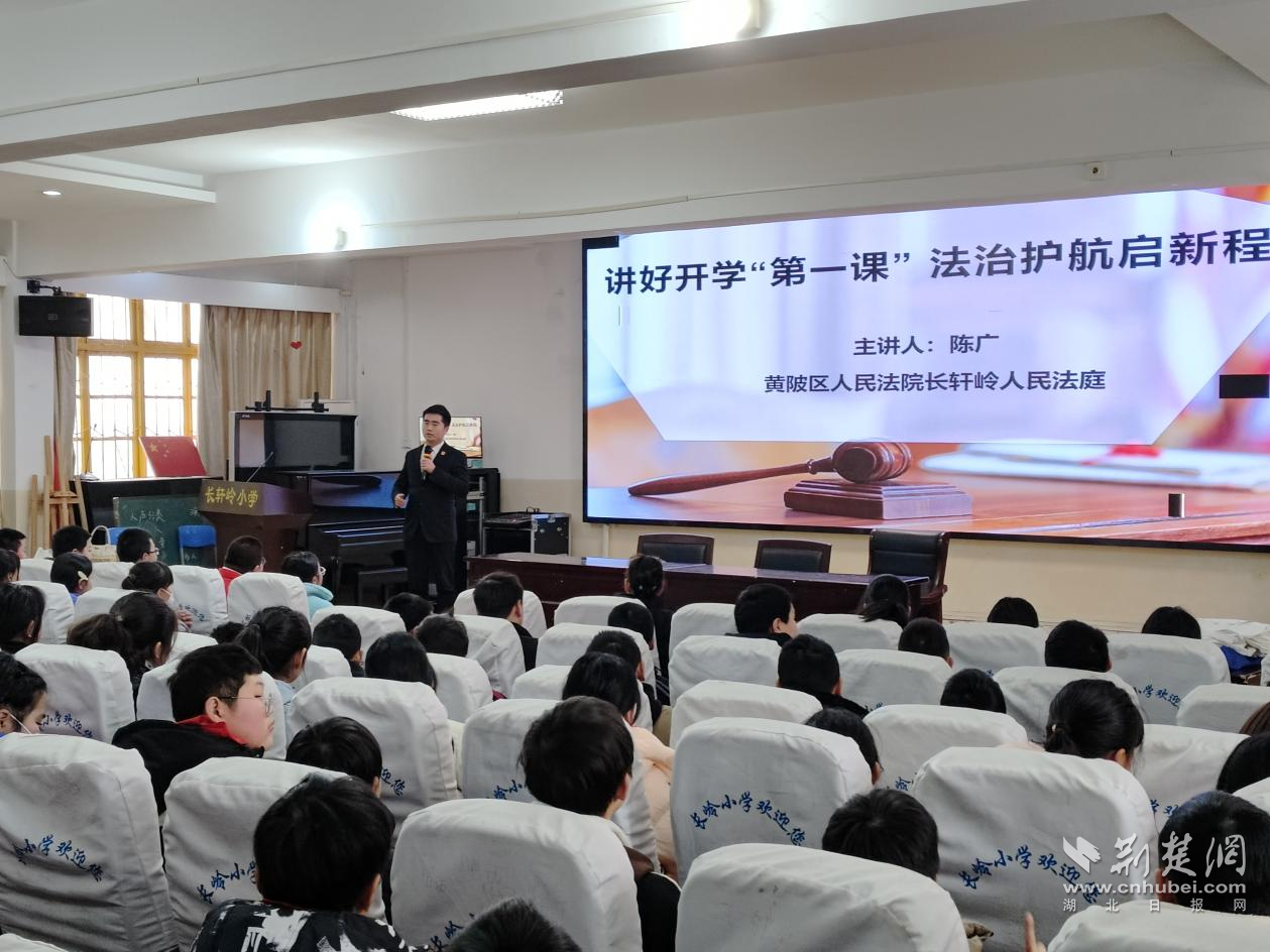荆楚网(湖北日报网)讯(通讯员 王鹤翔、郑宇萱)为助力青少年健康成长,巩固加强青少年法治意识,提升青少年知法、懂法、用法水平,2月14日,黄陂区法律援助中心、长轩岭司法所、长轩岭人民法庭走进长岭小学,开展法治“童”行之“开学第一课”普法宣传活动,以一堂别开生面的法治课拉开了新学期法治教育的序幕。长岭小学六年级师生160余人参加活动。
