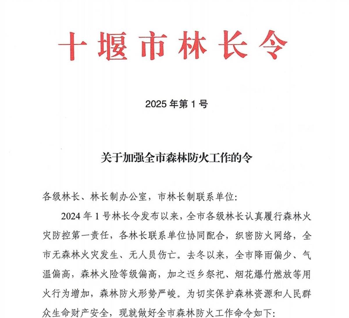 2月10日,湖北十堰市发布2025年1号林长令《关于加强全市防火森林防火的令》,要求全市各级林长认真履行森林火灾防控第一责任,织密防火网络,切实保护森林资源和人民群众生命财产安全。