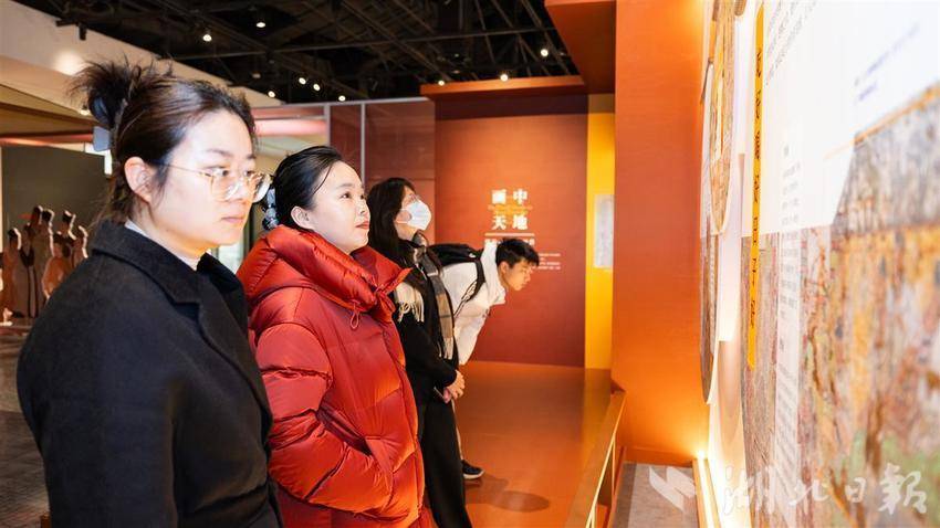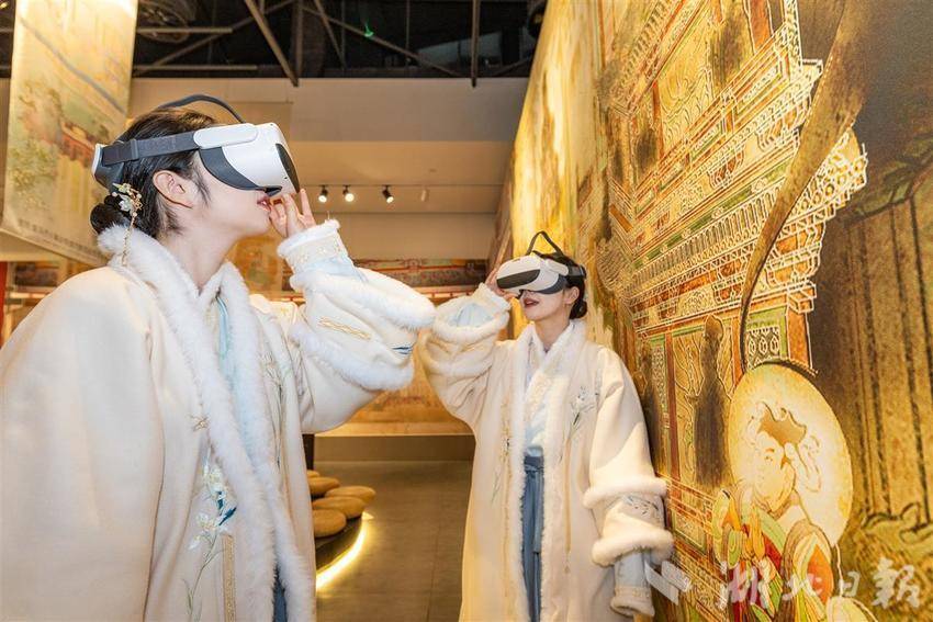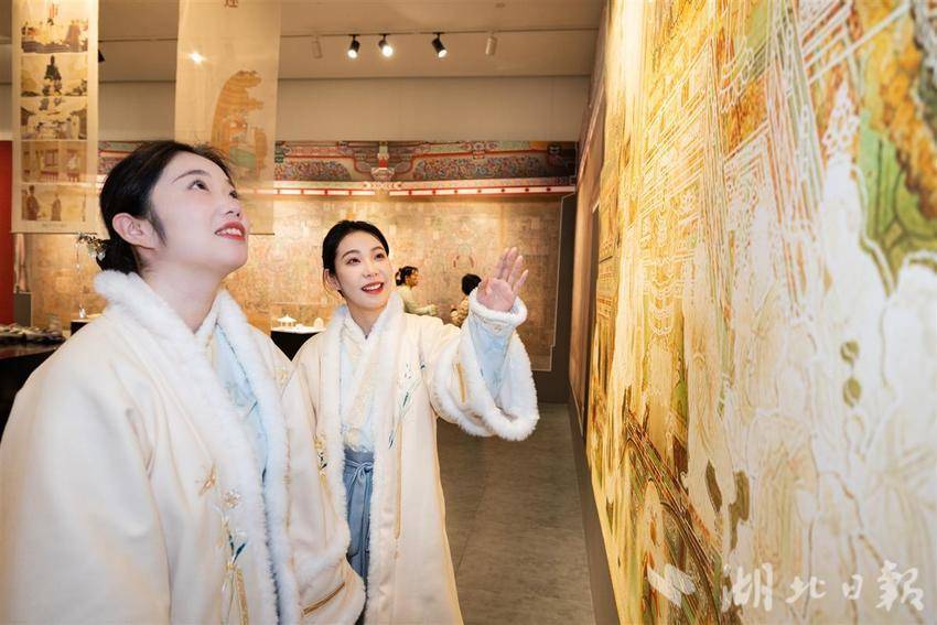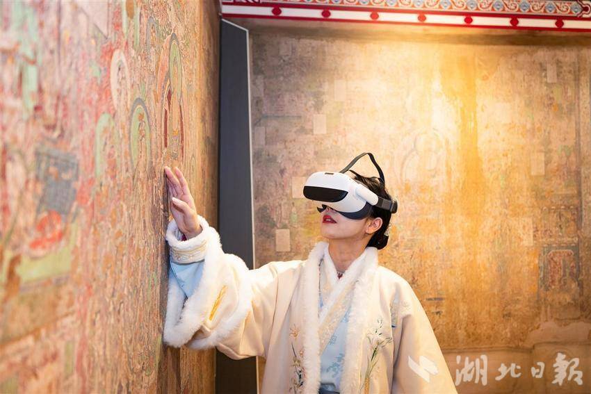 2004年起,清华大学建筑学院师生陆续对开化寺宋代建筑与壁画开展详细勘察、数字化测绘等,致力于让绚丽的彩画“活起来”、沉睡的国宝“走出去”。武汉作为该展全国巡展首站,展览上综合运用VR、裸眼3D、沉浸式影片,打破物理空间壁垒,并结合二维图像、三维模型、大型装置等现代科技手段,实现“整体建筑空间”的多尺度、多维度呈现,让观众走进“壁画上的清明上河图”,沉浸式感受宋“潮”生活。(湖北日报全媒记者 何宇欣 通讯员盖伟涛 摄)