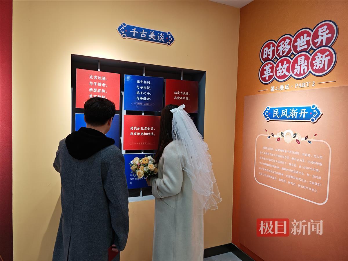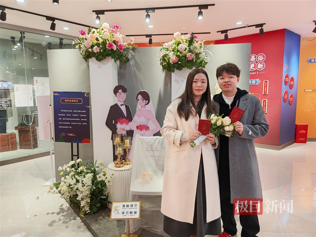 “我们自愿结为夫妻,从今天开始,我们将共同肩负起婚姻赋予我们的责任和义务……”在工作人员的见证下,程思源和爱人燕涵郑重宣读了结婚誓言,许下了相伴一生的承诺。领完结婚证后,这对新人又来到了位于一楼的婚俗文化馆,通过观赏与婚俗文化相关的图片、文字和实物,深刻感受到了传统文化的深厚底蕴和新时代婚姻的多样魅力。