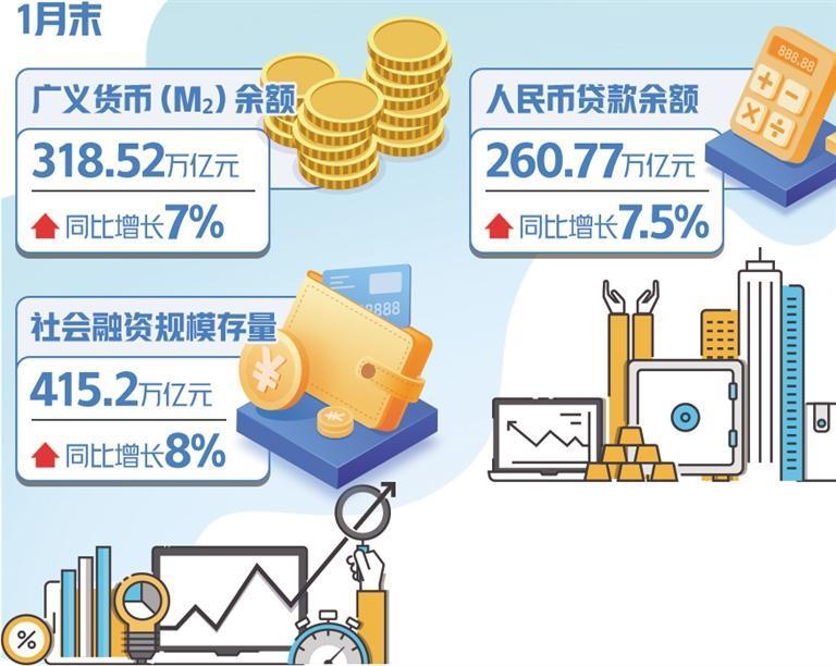2月14日,中国人民银行发布最新数据显示,1月末,广义货币(M_2)余额318.52万亿元,同比增长7%;社会融资规模存量415.2万亿元,同比增长8%;人民币各项贷款余额260.77万亿元,同比增长7.5%。其中,1月份社会融资规模增量为7.06万亿元,比上年同期多5833亿元,为历史同期最高水平;贷款新增5.13万亿元,比上年同期4.9万亿元的高基数还略高一些,为经济平稳开局提供了有力的金融支持。