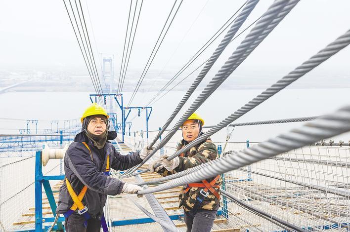 2月11日,小雨淅沥,体感温度接近零摄氏度,站在鄂州燕矶长江大桥主桥墩顶,寒风呼呼地刮,大桥施工猫道上,工人们正忙着检查刚架设好的一股约碗口粗的悬索。