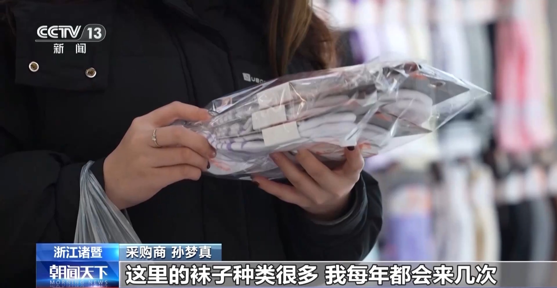 采购商 孙梦真:这里的袜子种类很多,我每年都会来几次。最近这里有一些新产品,我要采购一些回去,很好卖的。