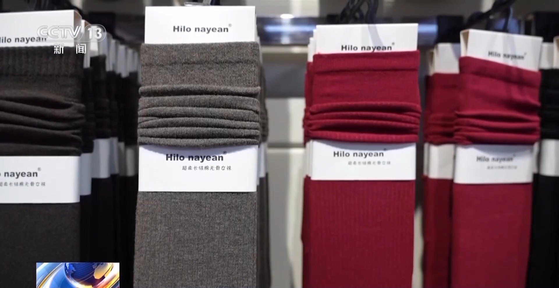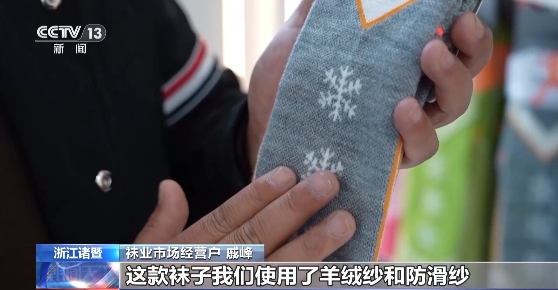 袜业市场经营户 戚峰:这款袜子我们使用了羊绒纱和防滑纱,在运动的时候既保暖又增加脚底摩擦力,是我们今年的最新款。