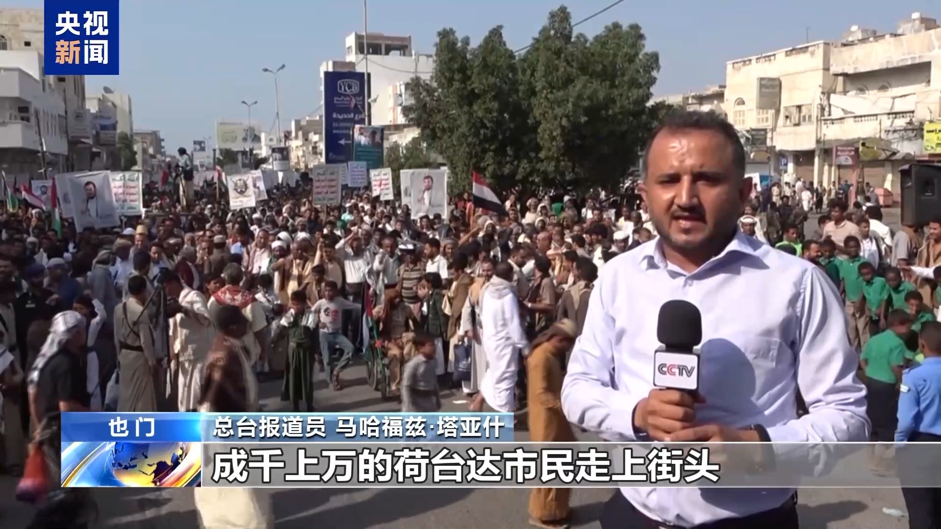总台报道员 马哈福兹·塔亚什:成千上万的荷台达市民走上街头,抗议美国总统最新的涉巴勒斯坦言论以及阻碍加沙地带停火的行为。他们宣布已做好充分准备,应对未来任何冲突。