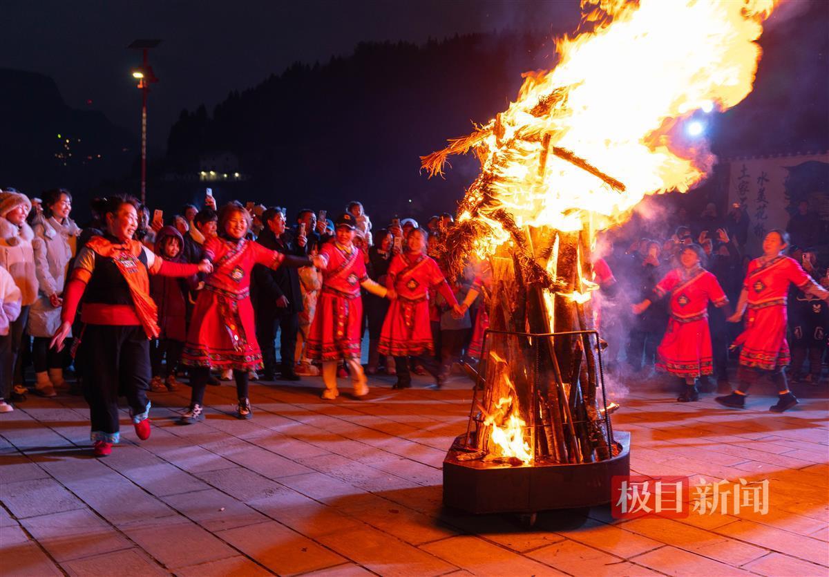 暮色渐浓时,村委会门前的广场上燃起了一丈高的篝火。这是“赶毛狗”仪式的核心场域——土家人相信,燃烧的火焰能驱赶带来灾祸的“毛狗”(山间野兽),护佑新年五谷丰登。