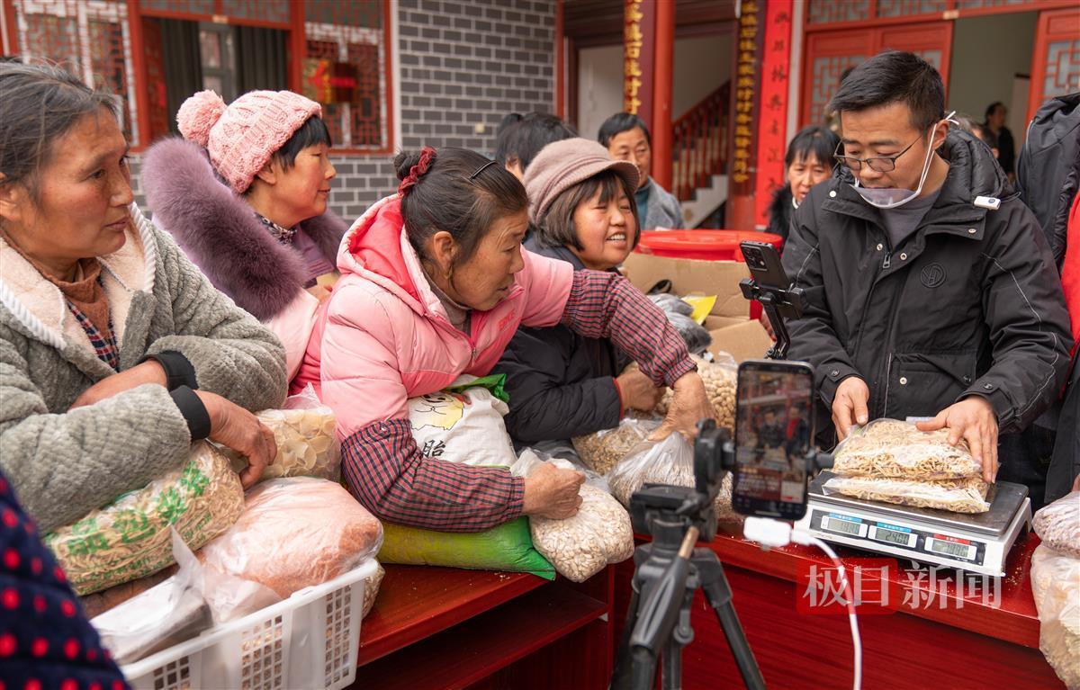 村民们带着自家制作的辣椒面、豆豉、烟熏腊肉、野生葛根粉等30余种山货,将直播间围得水泄不通。