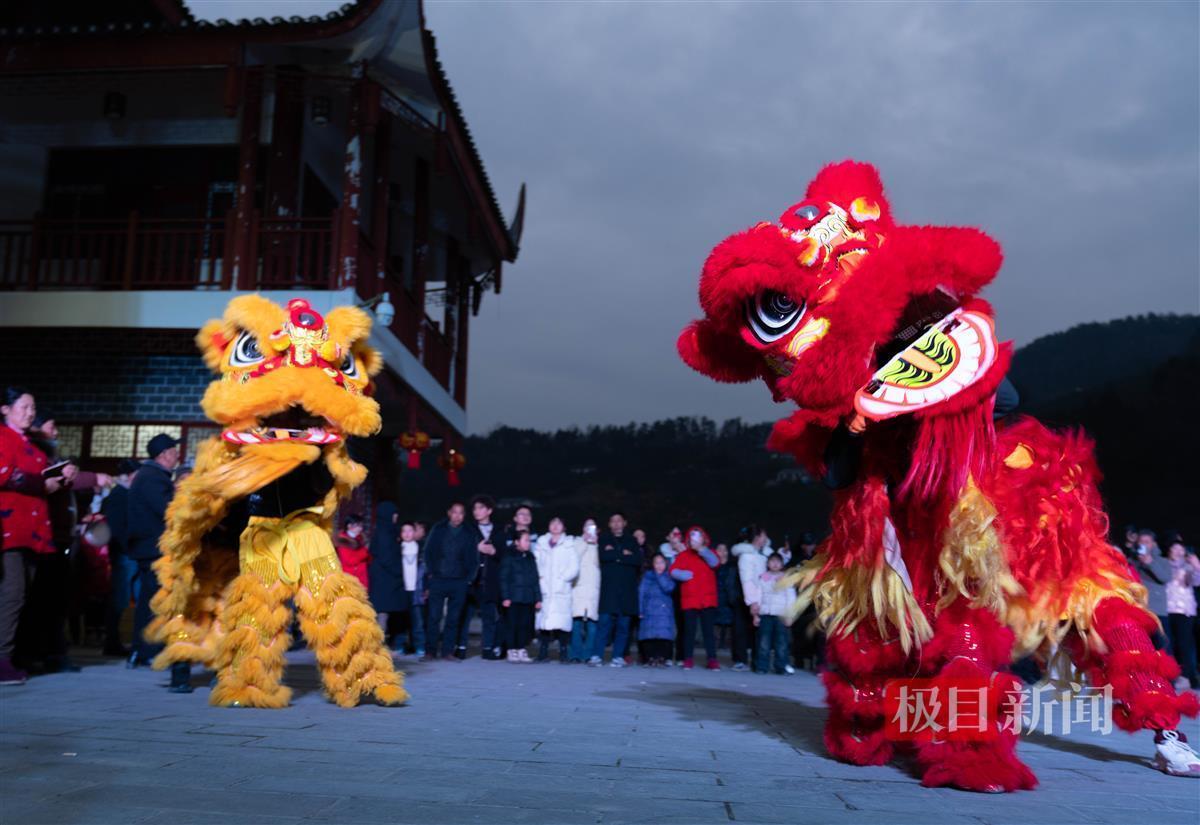 午后两点,铜锣声划破山涧宁静。蜿蜒的村道上,瑞狮欢腾,采莲船的彩绸在风中翻飞,一串串红灯笼将青瓦白墙的土家山寨装点得喜气盈盈。