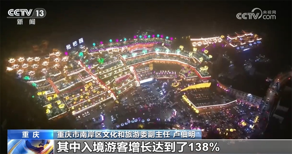 重庆市南岸区文化和旅游委副主任卢佃明称:“无人机表演同时也点亮了重庆夜景文化这张品牌,围绕着夜景文化,我们也做了很多消费场景的打造。流量变留量,2025年1月份,全区接待过夜游客同比增长32%,其中入境游客增长达到了138%。”