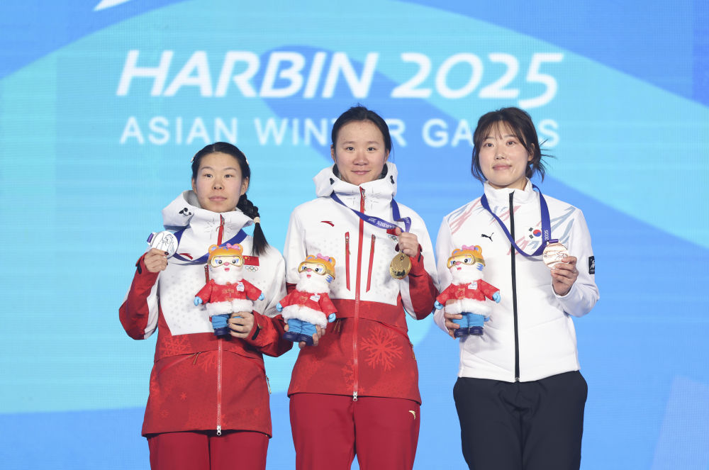 2月10日,第九届亚冬会速度滑冰女子3000米决赛在哈尔滨举行。中国选手杨滨瑜、韩梅、太智恩分别获得冠、亚、季军。新华社记者 王曦 摄