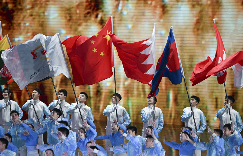 这是2月14日拍摄的各体育代表团入场环节。当日,第九届亚洲冬季运动会闭幕式在哈尔滨举行。新华社记者 黄博涵 摄