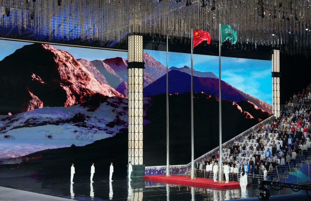 2月14日,中华人民共和国国旗和沙特阿拉伯国旗在闭幕式现场升起。当日,第九届亚洲冬季运动会闭幕式在哈尔滨举行。新华社记者王建威摄