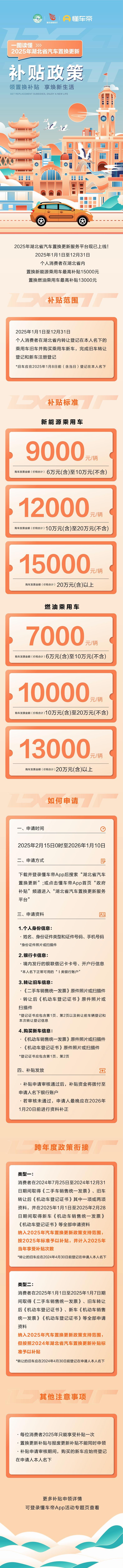 湖北汽车置换更新补贴来了!2月15日0时,2025年湖北省汽车置换更新服务平台正式上线。
