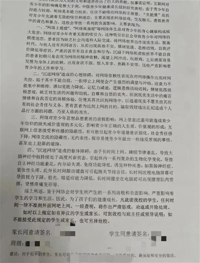 帖文还显示,该校还发布了一则关于上网的校规称,网络对学生有一系列消极和负面的影响,严重影响学生的生活和学习。凡就读该校的学生,任何时间一律不准到外面网吧上网,一经查明,将作出严肃惩戒、劝退或开除处理。学校还建议家长,将家中网络和电视拆除,才是最好、最保险和安全的做法。
