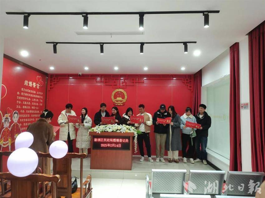 湖北日报讯(记者李光正、通讯员朱军丽)2月14日,甜蜜浪漫的气息弥漫在武汉市新洲区民政局婚姻登记处,一场别开生面的婚俗文化系列活动在此温情上演。众多新人在这充满爱意的日子里,不仅领取了结婚证,更沉浸式体验了一场传统与现代交融的婚俗文化之旅。