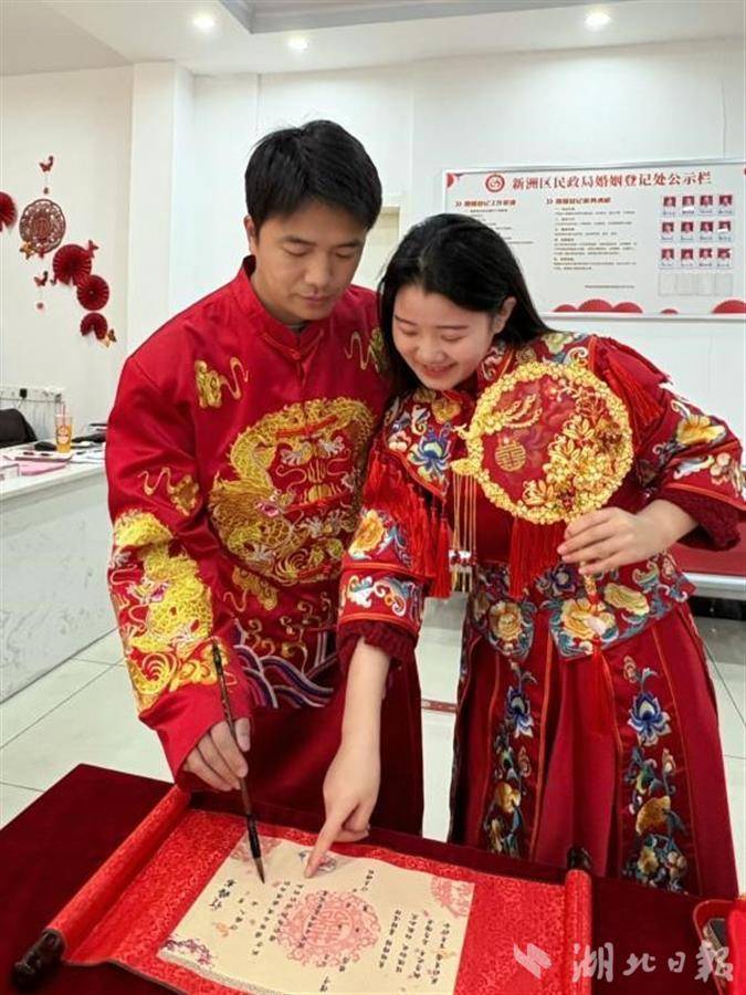 新洲区民政局婚姻登记处相关负责人说,此次活动不仅为新人们的领证日增添了独特记忆,还加强了婚俗改革宣传和推广力度,让更多人了解和传承优秀的婚俗文化。