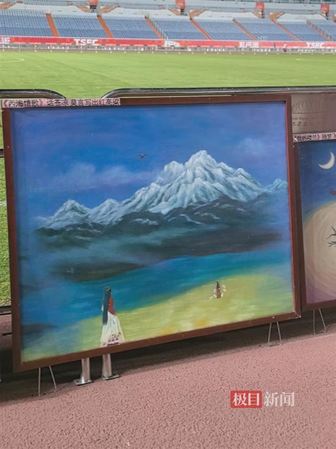 极目新闻记者注意到,现场还摆放着14幅巨幅油画,吸引不少歌迷驻足观看。油画作者丁俊峰告诉记者,他是济南莱芜人,喜欢刀郎有二十多年时间。这14幅油画,是他根据刀郎唱过的歌曲画就的,画作内容都是歌曲相关信息,总共花费了两年时间。接下来,他想继续画,也希望能让更多“刀迷”看到自己的画作,“会画七八十幅吧”。