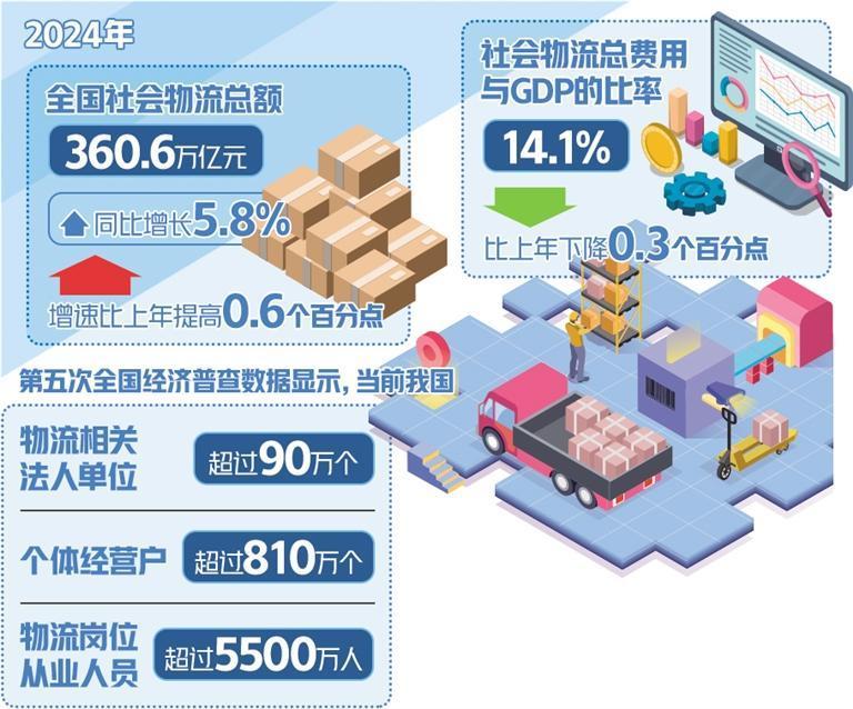 中国物流与采购联合会近日公布的数据显示,2024年全国社会物流总额360.6万亿元,同比增长5.8%,增速比上年提高0.6个百分点。物流运行环境不断改善,市场规模优势继续巩固,全年物流运行呈现积极变化。