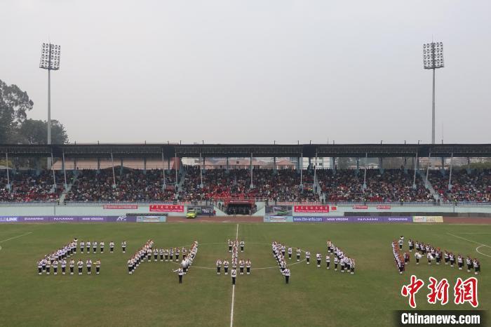 2月15日,第二届中尼友谊足球赛在尼泊尔加德满都举行,尼泊尔军乐团在比赛开幕表演中摆出“CHINA”字样。记者 崔楠 摄