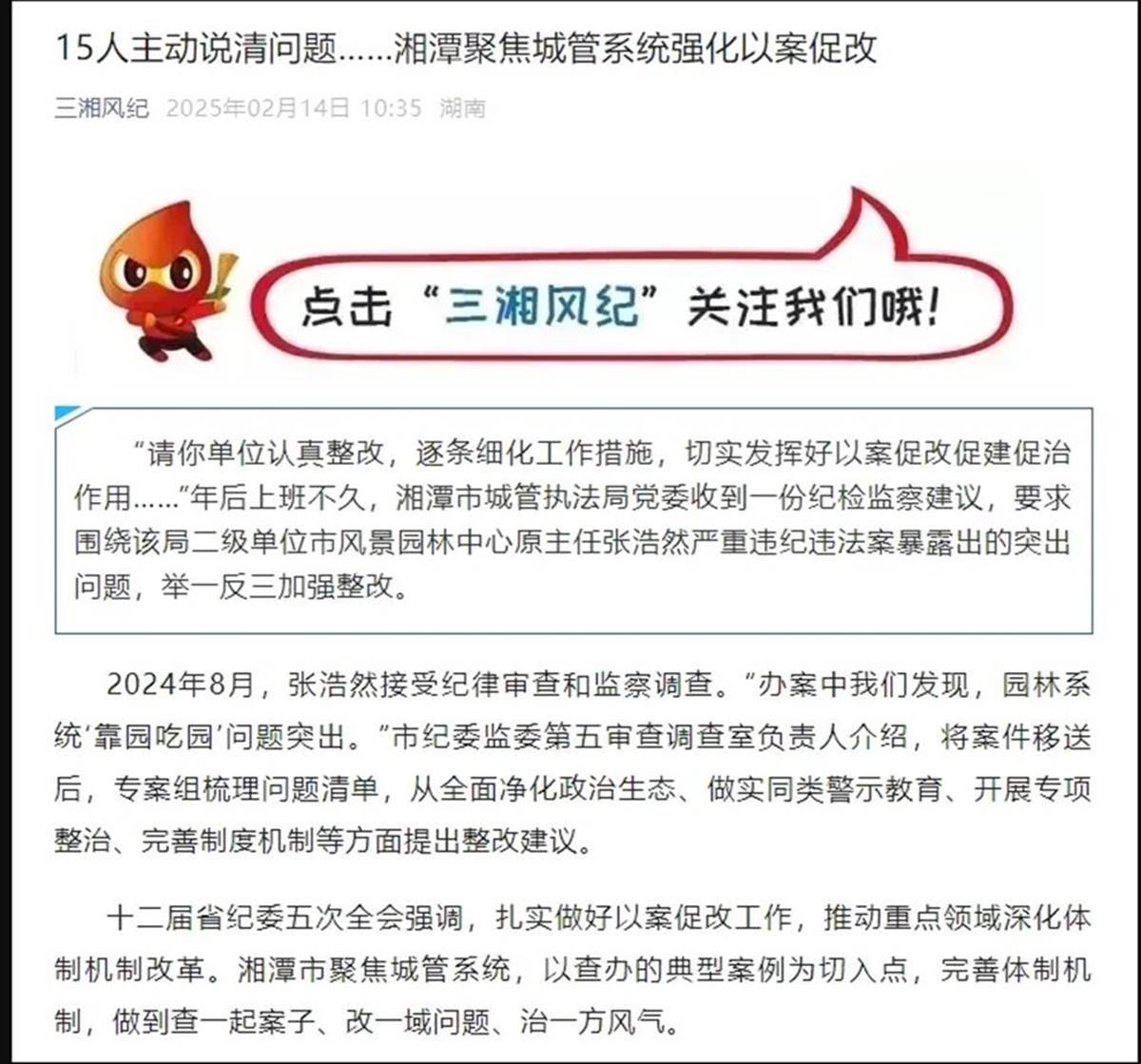 湘潭市纪委监委驻市城管执法局纪检监察组负责人介绍:“案发后,第一时间督促市城管执法局党委组织风景园林中心召开干部职工大会,以典型案例为引导,讲政策、敲警钟、划红线。”会后,15名同志主动向组织说清问题,上缴违规违纪资金10.86万元。