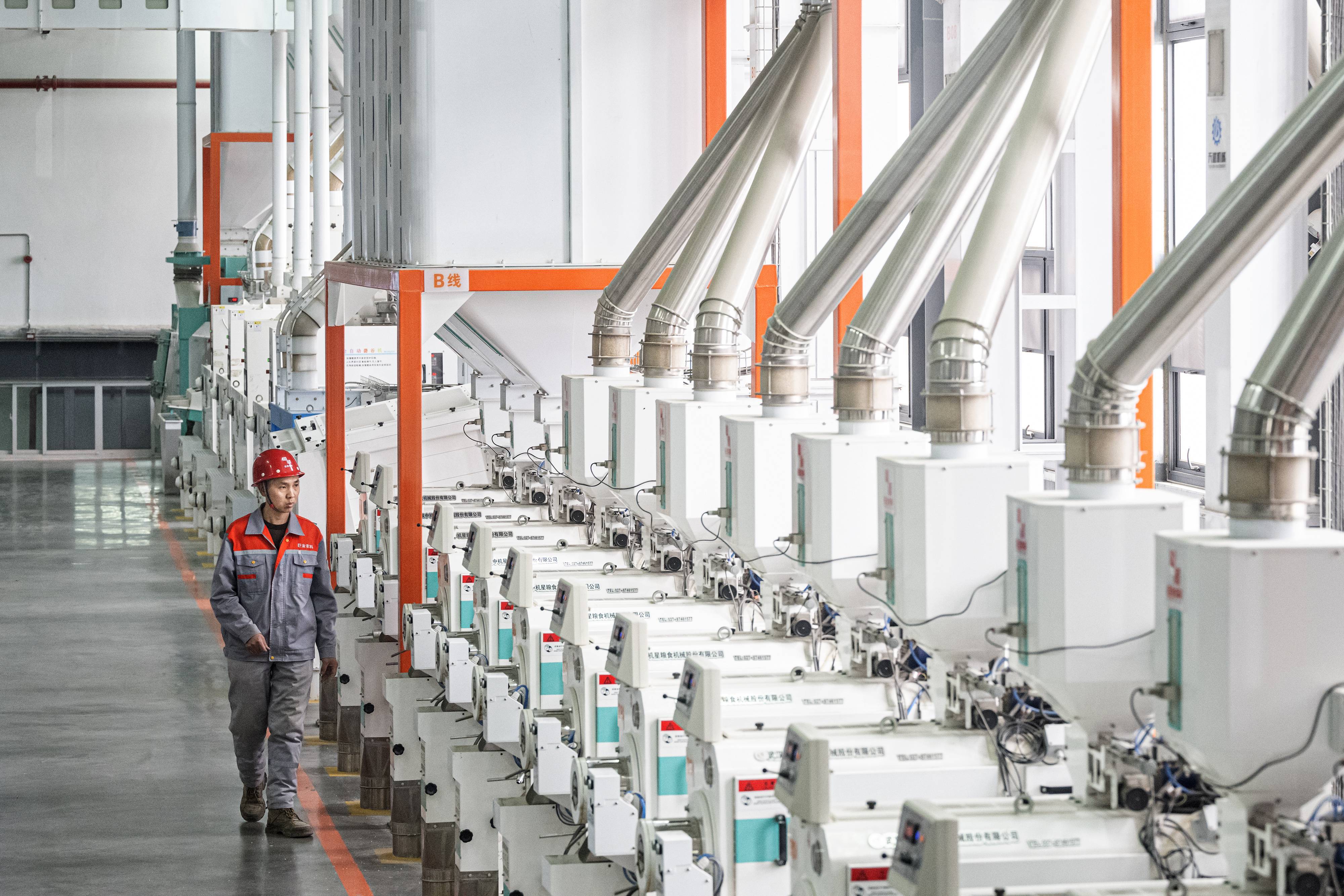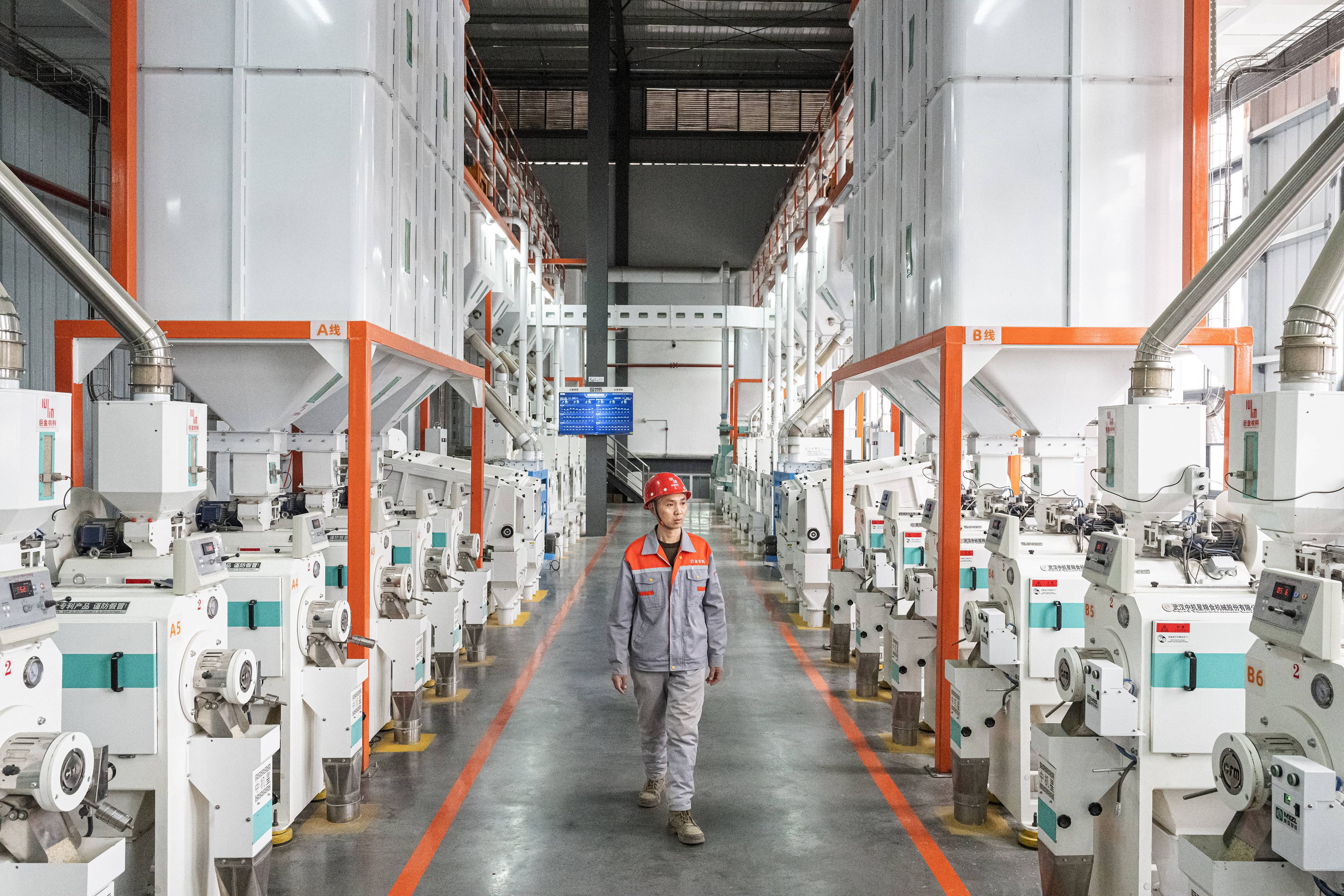 2月13日,位于潜江市的巨金米业有限公司智能生产线机器林立、轰鸣声声,这也是潜江市首家省级5G工厂,从原粮出仓到成品打包,整个生产过程实现高度自动化和智能化。(湖北日报全媒记者 任勇 摄)