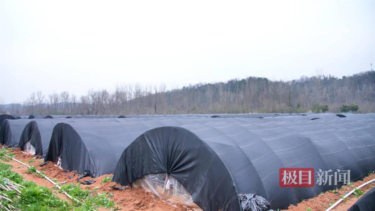 2月13日,在花园村临近沮河的一片平地上,黑色的恒温大棚遍布原野,像一座座黑色宫殿。掀开棚帘望去,一株株羊肚菌崭露头角、长势喜人。村党支部书记杨海亭告诉极目新闻记者,这样的恒温大棚有650个,占地160亩,是村里引进的食用菌种植专业户汪宗斌的项目。
