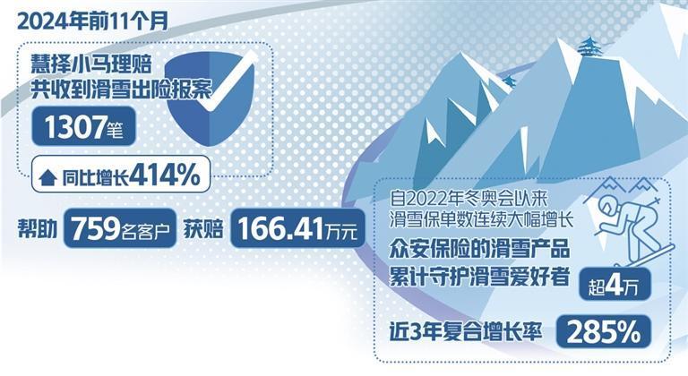 冰雪经济热了起来,对冰雪保险的需求也跟着多了起来。数据显示,自2022年冬奥会以来,滑雪保单数连续大幅增长,众安保险的滑雪产品累计守护超4万滑雪爱好者,近3年复合增长率285%,累计赔付超百万。去年前11个月,慧择小马理赔共收到滑雪出险报案1307笔,滑雪出险报案量同比增长414%,帮助759名客户获赔166.41万元,出险量最多的地区分别是吉林、新疆和河北。
