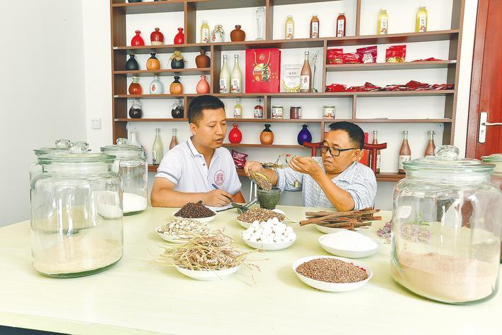 湖北楚寨发酵制品公司总经理向亮亮(左)和父亲向成军潜心研究祖传酒曲技艺。(湖北日报通讯员 郑家裕 摄)