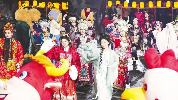 在首个“非遗版”春节,宣恩县依托当地玉帝七女下凡化作七姊妹山的浪漫传说,大胆创新,借助现代声光电技术,将传统文化进行创意转化。当地新打造的沉浸式实景秀《七仙女的传说》,游客能看到飞天仙女身披七彩霓裳,脚踏神兽鲲鹏,游客仿佛置身神话世界,开启一场沉浸式穿越之旅。湖南游客邬清波说:“七仙女的表演让我大开眼界,新的技术让传统文化更亮眼。”