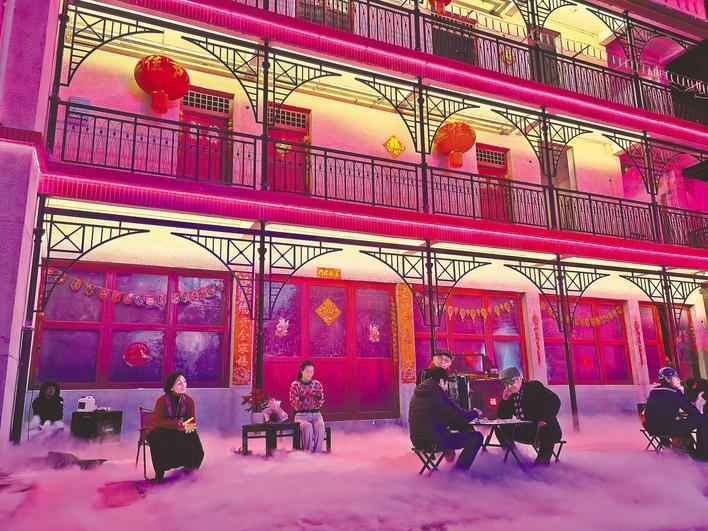 2月15日晚,武汉市百年老街青山正街举办“钢火淬新·青春正燃”城市更新艺术展演,演员们身着上世纪五六十年代的服装,在老房子前还原半个多世纪前的生活场景。 (湖北日报全媒记者 余瑾毅 通讯员 毕可 摄)