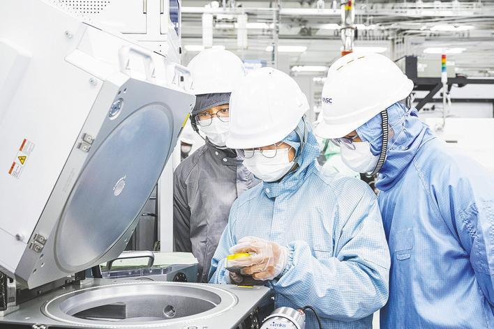 生产调度大楼通过连廊与晶圆厂连接。22时,记者换上防尘服,在湿法工程师洪绍鑫的带领下参观产线。