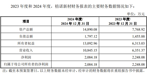 2023年,棓诺新材实现营业收入6,351.37万元,实现净利润2,248.08万元;2024年棓诺新材实现营业收入10,845.15万元,净利润2,084.18万元。