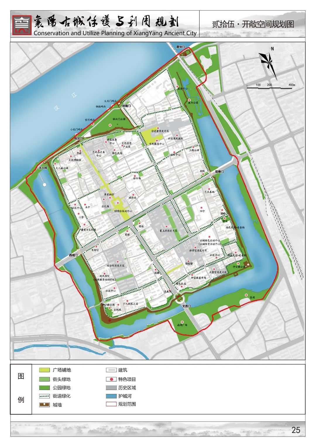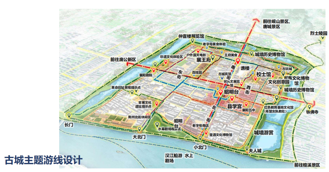 以昭明台为核心,打造轴线北部历史文化片区;以谯楼—襄王府周边为主体,打造轴线南部休闲演艺片区;以西护城河为依托,打造环线西部时尚休闲片区;以长门遗址公园为支撑,打造环线东部城防军事文化展示片区。