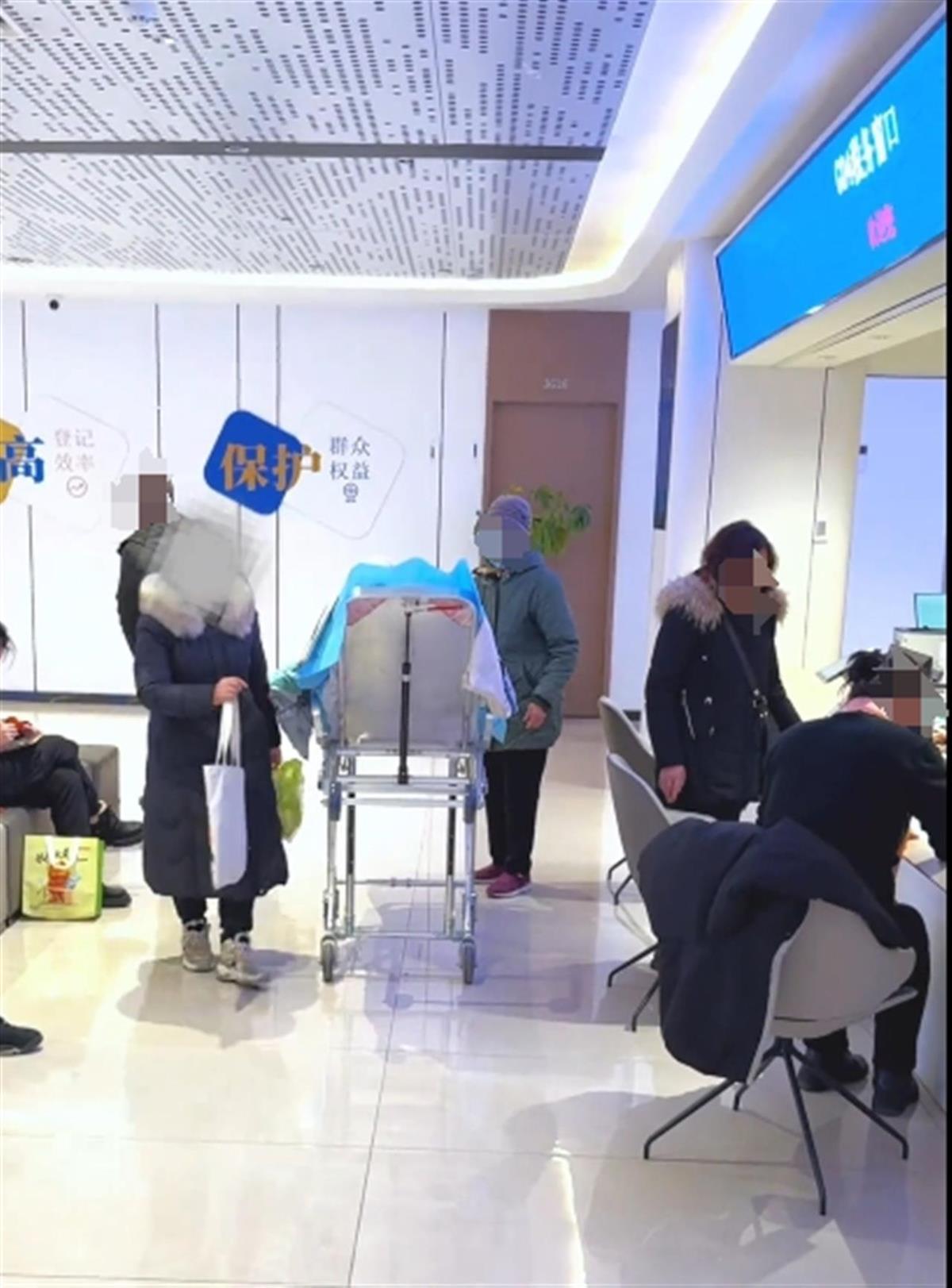 网友拍摄的视频中,一位老人躺在担架上在服务大厅,一旁有疑似家属在陪同。