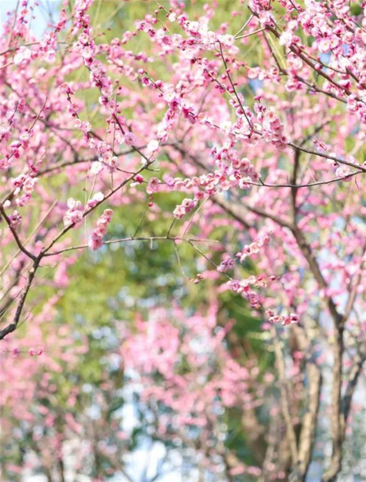 在家门口的口袋公园里,也能寻见梅花的踪影。武昌区秦园中路口袋公园沿线200米种植了110株梅花,形成了一片春日粉色梅林。这片梅林中,一部分为附近居民和志愿者于2019年4月栽种,如今梅树生机勃勃,形成一景,人们可就近赏梅。