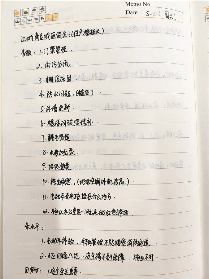 “好记性不如烂笔头,记在本子上才不会忘掉。”赵锁梅说,这些年她养成了一个习惯,每天到小区去的时候会带一个笔记本,将小区居民反映的问题一一记录下来,之后逐一进行落实。