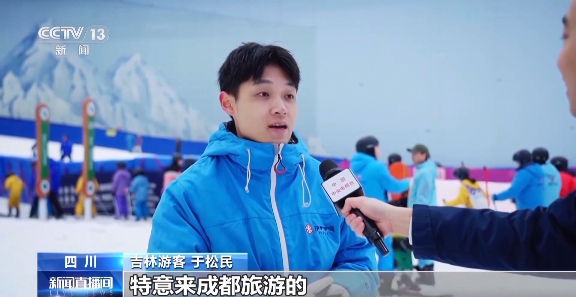 吉林游客 于松民:我是从吉林来的,特意来成都旅游的。然后就想特意体验一下成都市内的滑雪场,没有想到今天在这儿看到这么大的一个滑雪场。